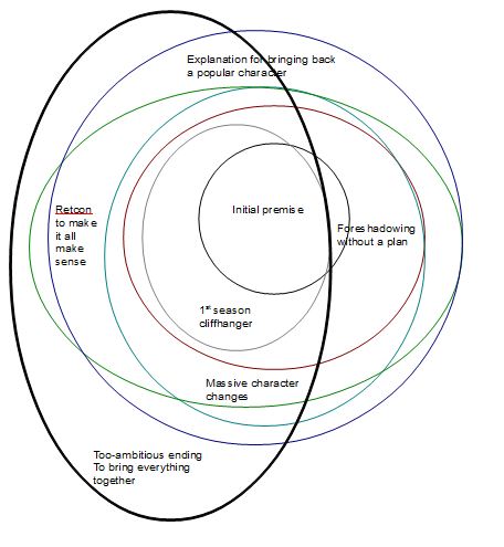 It's a mess. There's no plan, things get lost, forgotten, ignored, or worst of all, lose their impact because they get cut out of the story, by retcons or resurrections or whatever. This could be a chart for The X-Files or Battlestar Galactica, or it could be Angel or Buffy. The difference between the former and the Whedon shows is that the Whedon shows remembered character came before plot. Angel, especially, shifted into emotional resolution more than plot resolution after its excess of serialization in its 4th season caused problems.